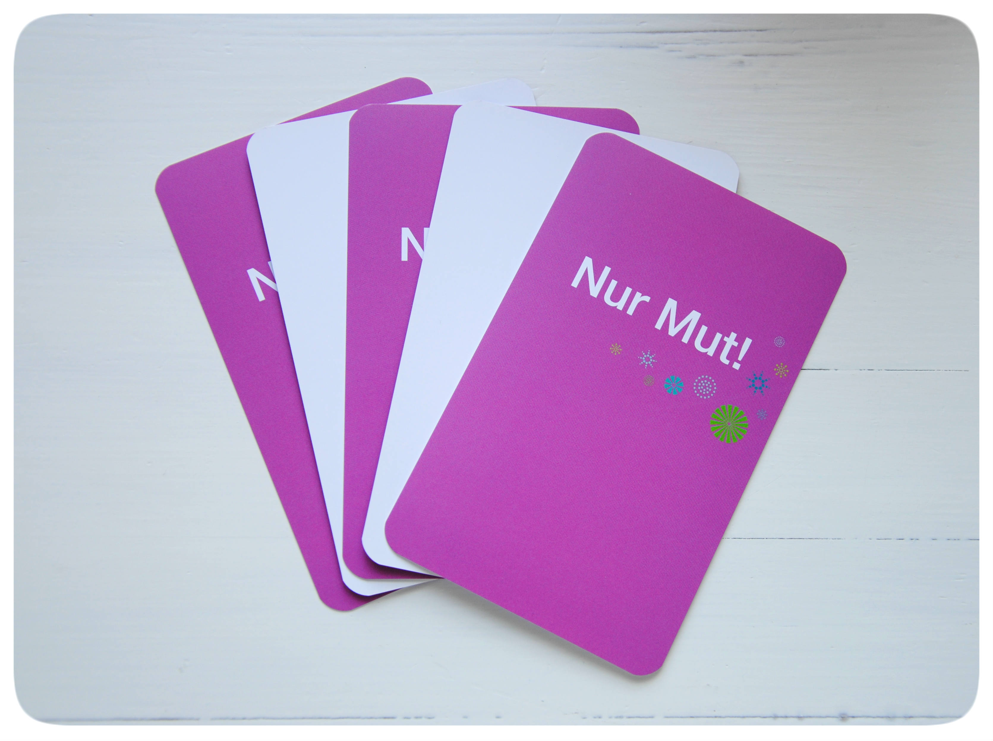 Da viele KäuferInnen meiner Mutkarten aus dem pädagogischen, sozialen und beratenden Bereich kommen und angeregt von meinen Mutkarten mit Gruppen bzw. KlientInnen damit arbeiten, habe ich mich entschlossen, DIY-(do-it-yourself) Mutkarten produzieren zu lassen: auf der Rückseite die Nur Mut!-Grafik wie beim fertigen Kartenset. Nur die Vorderseite ist leer und kann individuell selbst gestaltet werden. Für alle, die eigene Mut-Sprüche, Mut-Vorbilder etc. festhalten wollen. Auch gut geeignet als Grußkarte, wenn Mutkarten oder Mut-Tagebuch verschenkt werden.